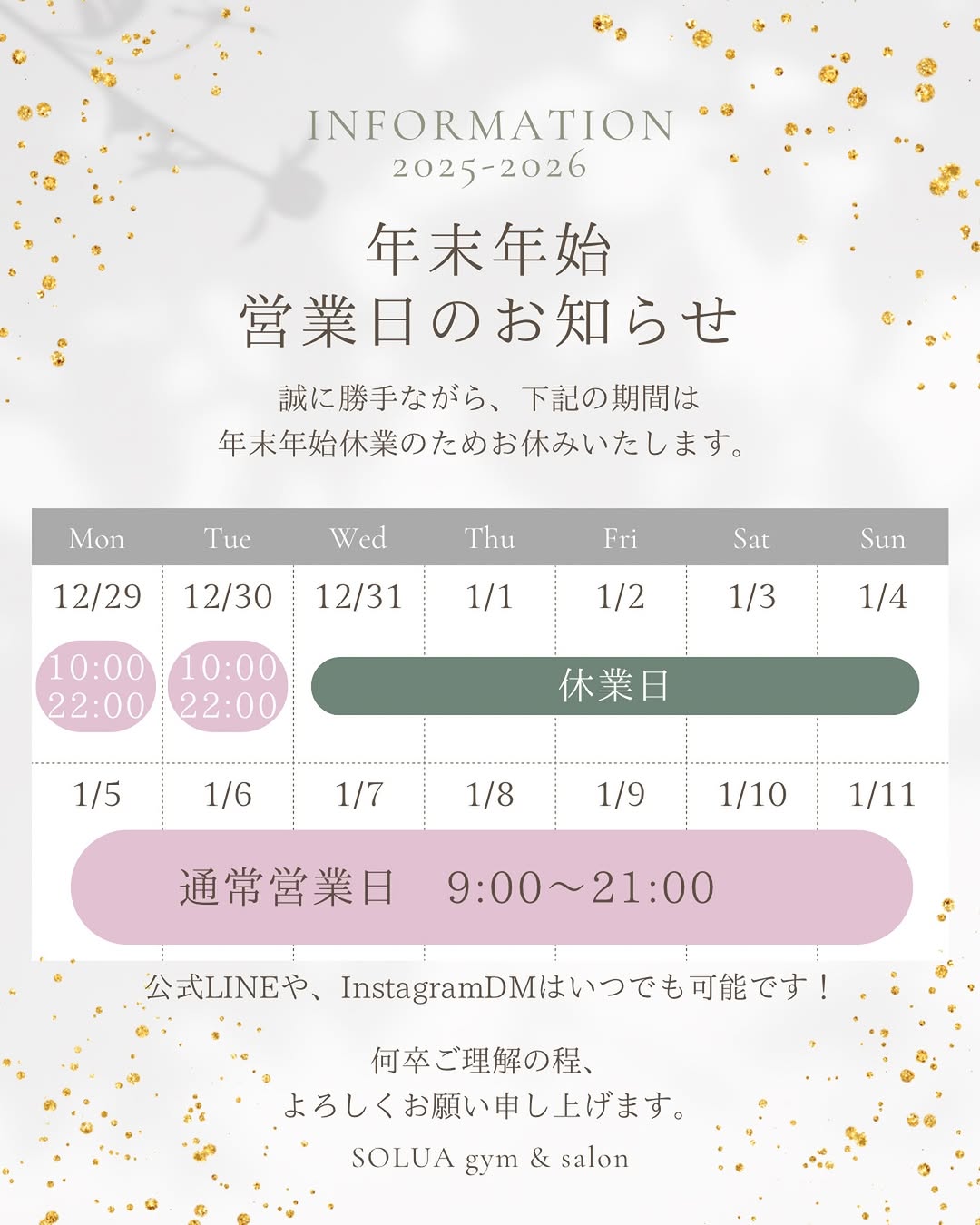 誠に勝手ながら、SOLUAは下記の期間、年末年始休業とさせていただきます。